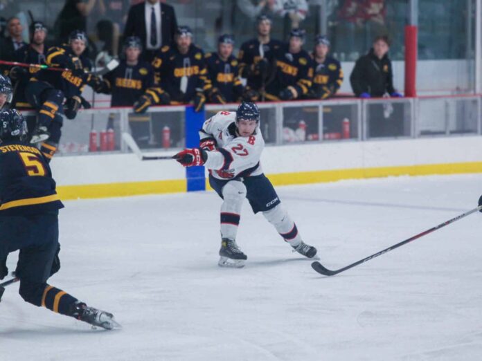 Near the five-minute mark of the second, defenseman Oliver Deroches flipped the puck into the Queens’ zone where it was picked up by a Gaels defender in the high slot.
