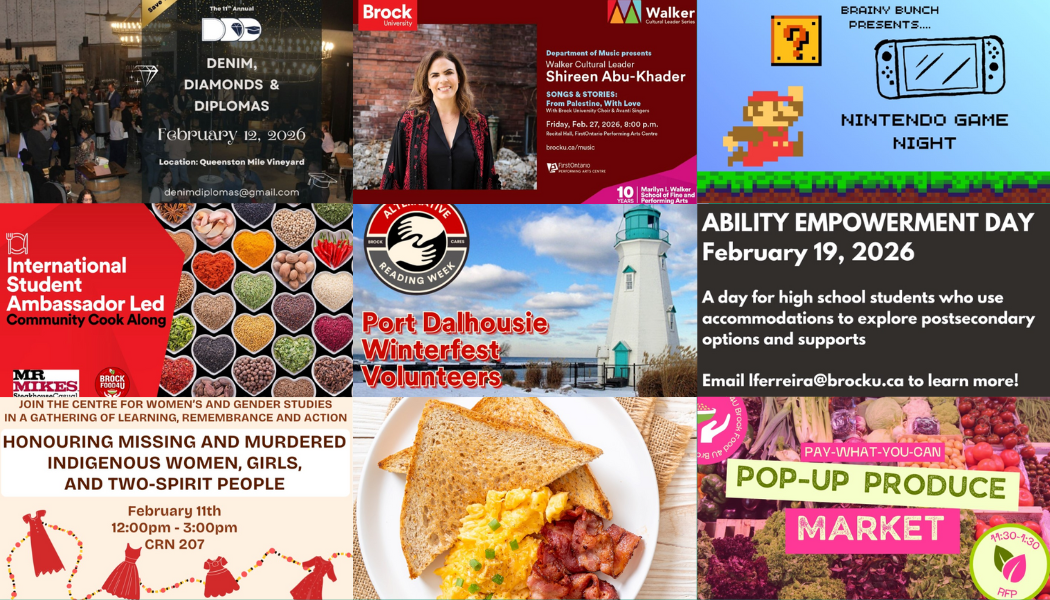 On Feb. 10 from 1:30 p.m. to 3:30 p.m. at GSB 306, Brock Brainy Bunch is throwing a Nintendo Game Night. On Feb. 12 from 7 p.m. to 10 p.m. at Queenston Mile Vineyard, the Brock Leaders Citizenship Society is hosting a night full of music, food, drink and a raffle table. The event titled Denim, Diamonds, and Diplomas is a non-profit fundraiser, with all proceeds going to first-generation students in our local community.